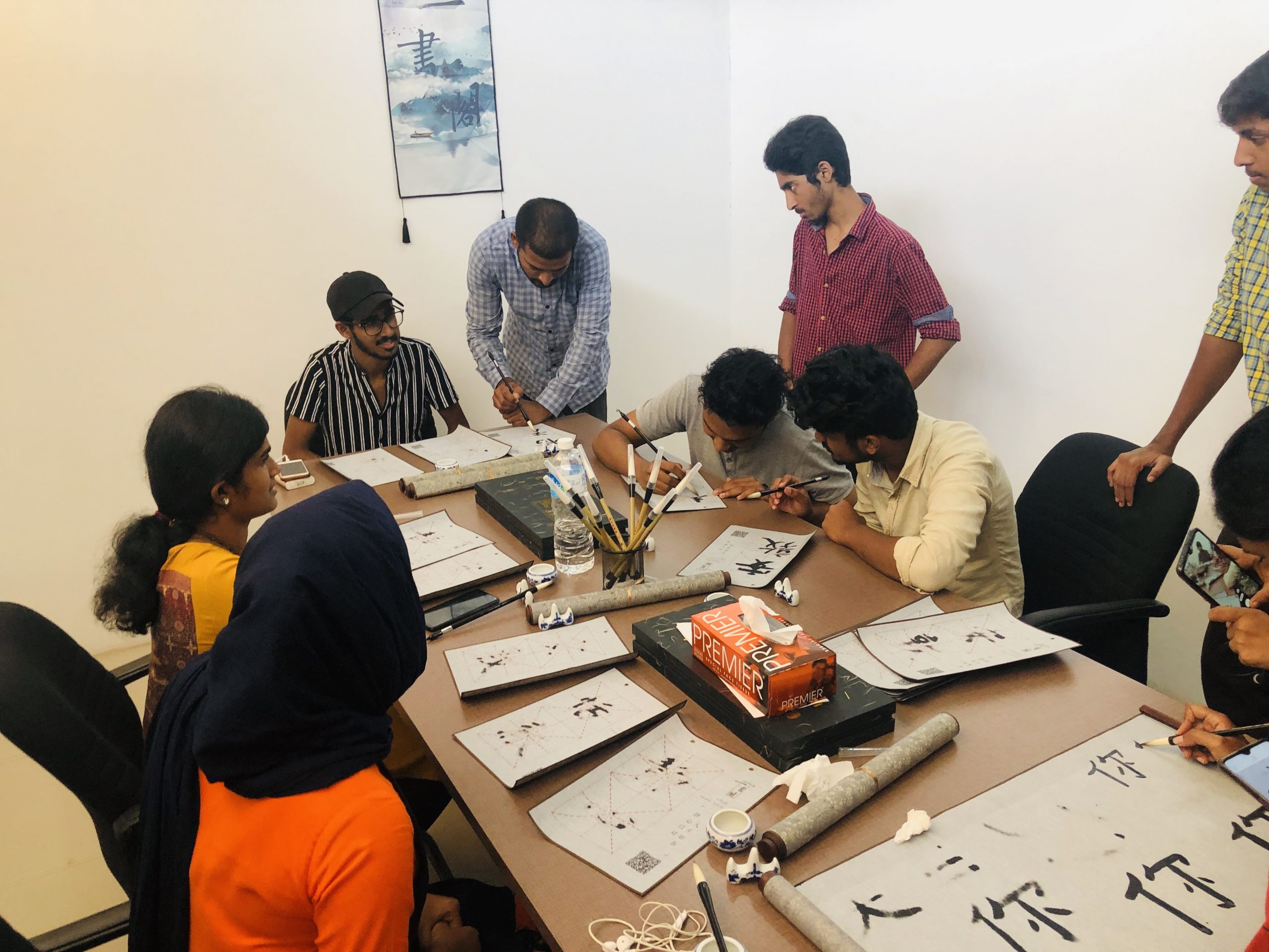 Chinese calligraphy is the writing of Chinese characters as an art form, this is the combination of purely visual art and interpretation of the literary meaning. CEECO conducts Chinese Language classes for all the freshers when they take admission in Chinese Universities. For the students to be familiar with the basics in Chinese language, CEECO International conducts classes with experienced and certified Chinese teacher. And as a part of Chinese language Class, Chinese calligraphy activity day was conducted for both, the students attending the language class and the staffs of the Company. The Chinese calligraphy has been widely practiced in China using tools like brush, ink; paper and inkstone.The Chinese Calligraphy serve as a medium of revelation and self expression. About 20 students of 2019 batch for Guangxi Medical University and Guangzhou Medical University actively participated in Chinese Calligraphy activity day. It created a good experience for the students to ink the Chinese letters. Not jus the students and the staff of CEECO, but the Director, Dr.Jazeer Abdul Khader and the teacher, Mr. Ravi Ranjan also participated in the activity.